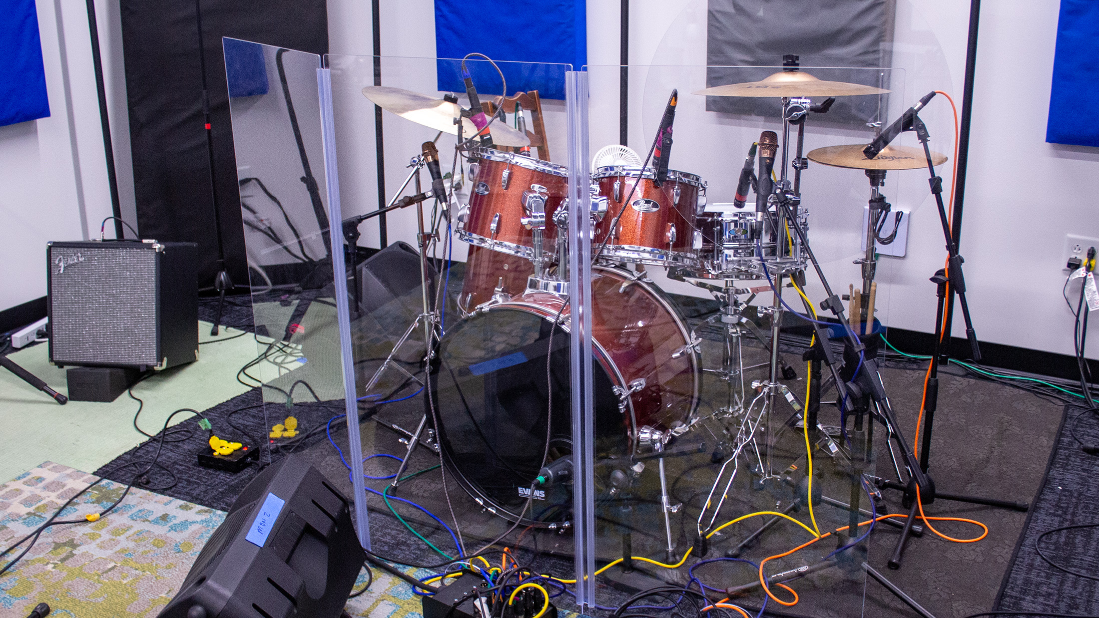 Our space just under 700 square feet and is equipped with 16 live tracks via Focusrite pulled into Ableton Live.